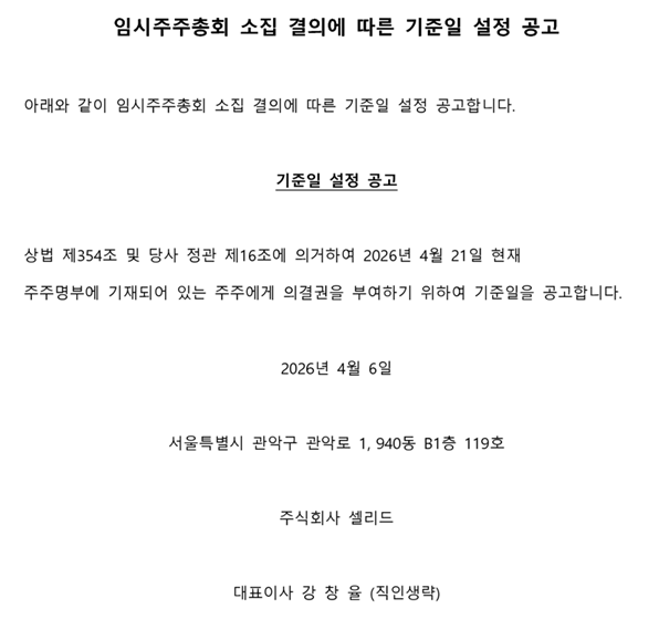 임시주주총회 소집 결의에 따른 기준일 설정 공고
